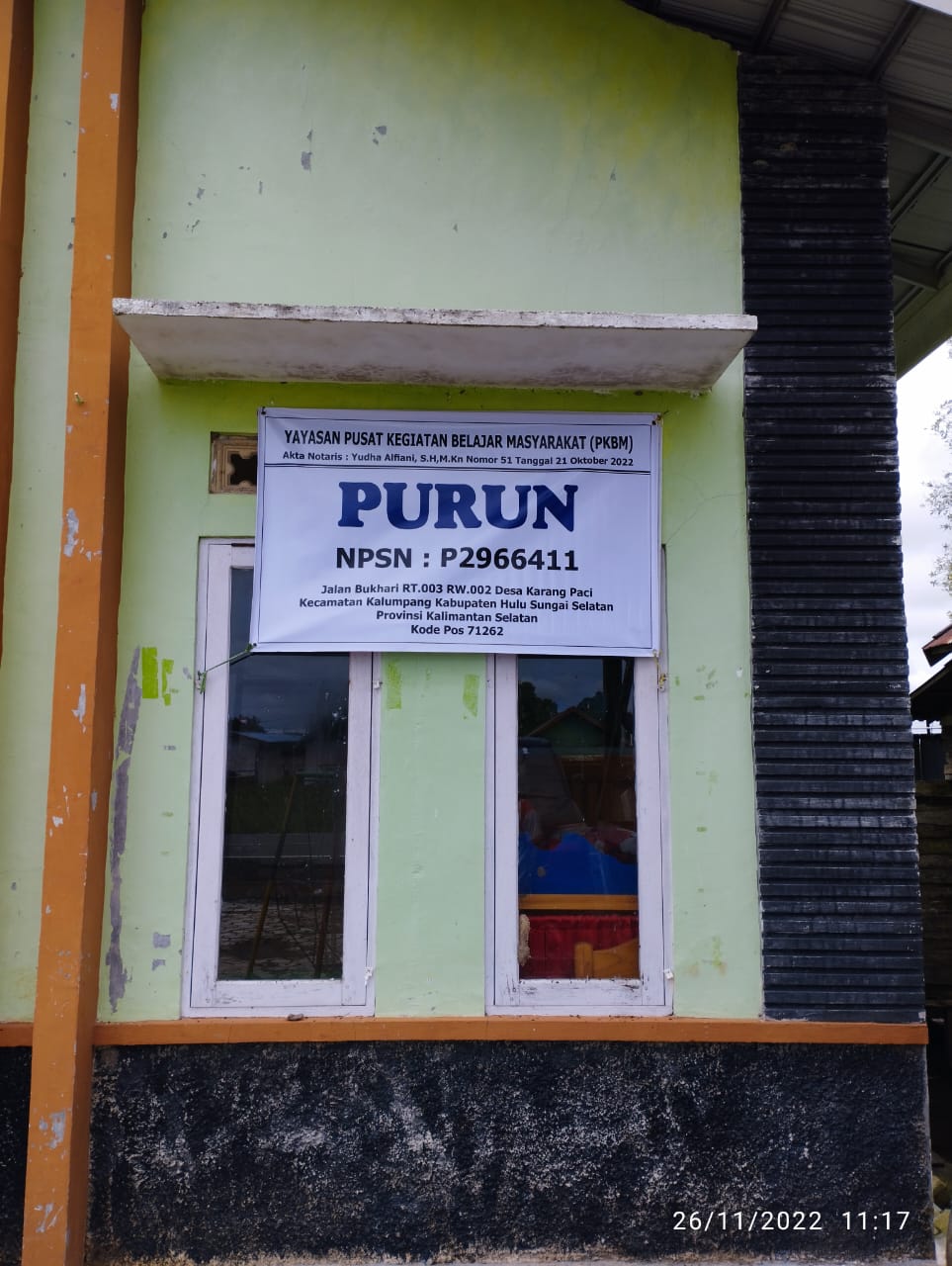 (AX6920) YAYASAN PUSAT KEGIATAN BELAJAR MASYARAKAT PURUN DESA KARANG PACI Jl.bukhari, -, Kec. Kalumpang, Kab. Hulu Sungai Selatan Prov. Kalimantan Selatan