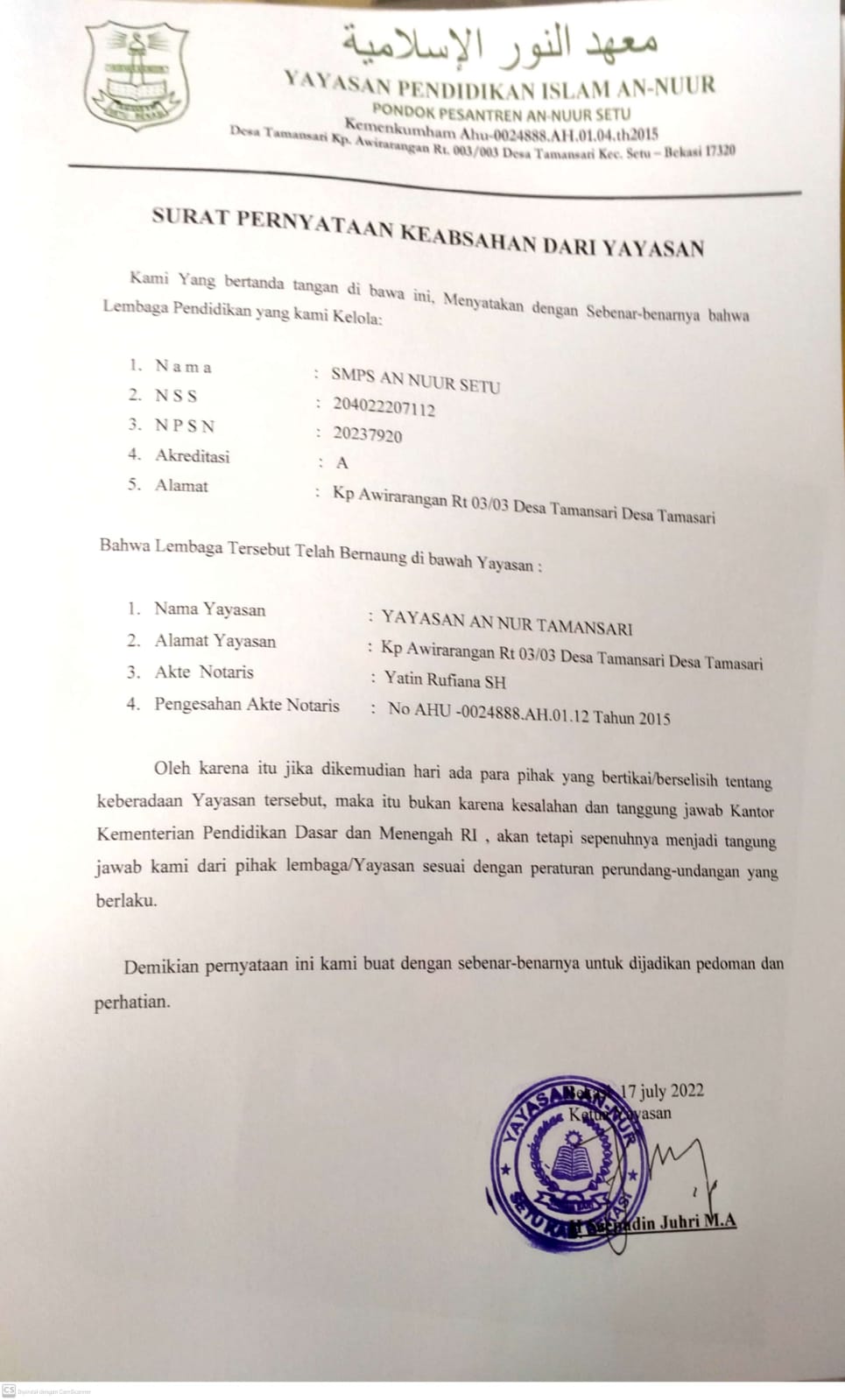 - Tgl Pendirian Yayasan : 19 Aug 2015