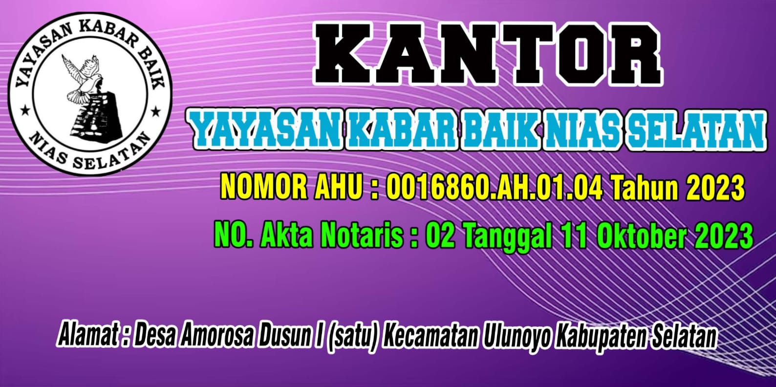 (AY4351) YAYASAN KABAR BAIK NIAS SELATAN Desa Amorosa, -, Kec. Ulunoyo, Kab. Nias Selatan Prov. Sumatera Utara