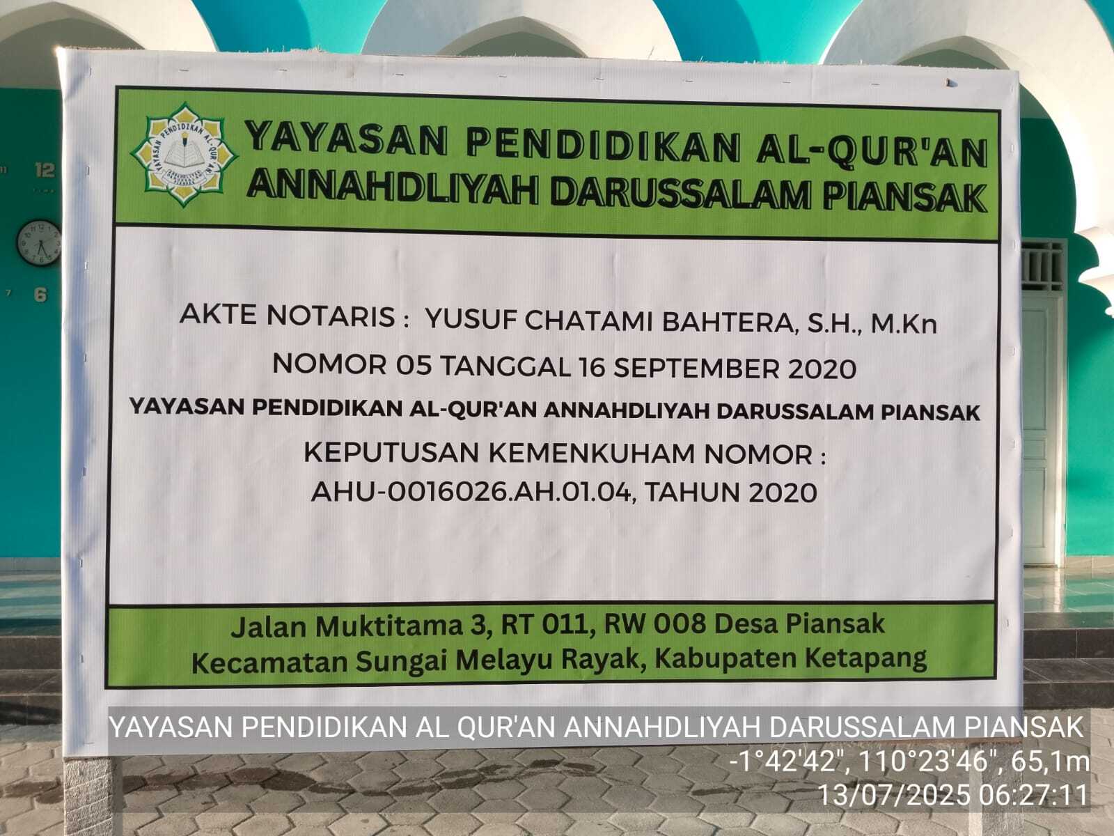 (AY9761) YAYASAN PENDIDIKAN AL-QUR'AN ANNAHDLIYAH DARUSSALAM PIANSAK Jalan Muktitama 3, RT. 011, RW. 008 Desa Piansak, Kecamatan Sungai Melayu Rayak,, -, Kec. Sungai Melayu Rayak, Kab. Ketapang Prov. Kalimantan Barat
